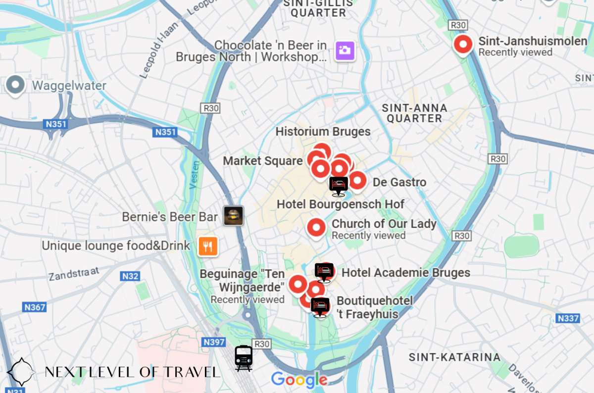A map of the locations of all the places you’ll see during your day in Bruges (get the full list in Google Maps). Hotels in order of coolness: Boutiquehotel 't Fraeyhuis (best!) | Dukes' Academie Brugge | |Relais Bourgondisch Cruyce