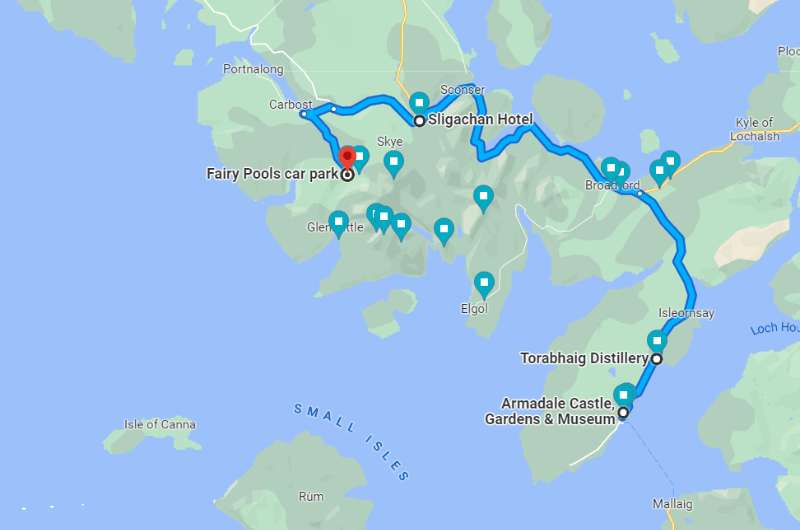 The reason there is a range of the number of stops is because the last site, Eilean Donan Castle, is on the mainland. You should stop to visit it on your way off of the Isle of Skye, so ideally in the morning after your last night on Skye.